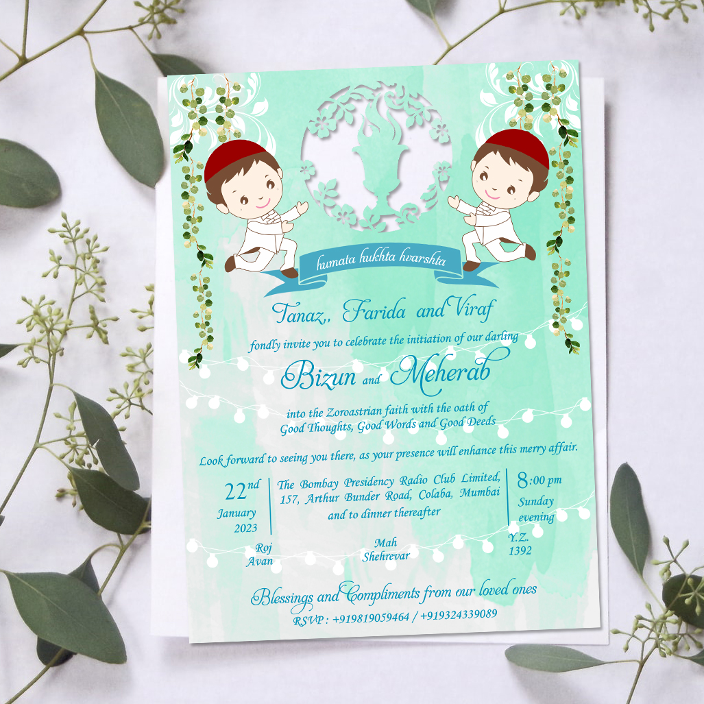 You are requested to share the rsvp at the earliest for the Navjote of Bizun and Meherab. We look forward to celebrating with you!